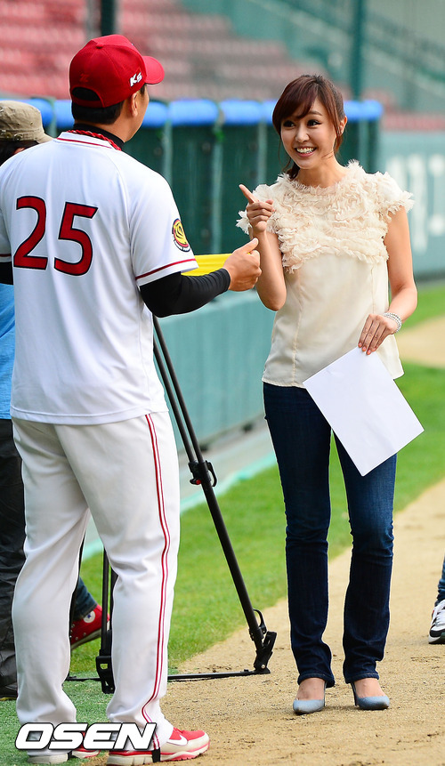 29일 오후 서울 잠실구장에서 두산 베어스와 KIA 타이거즈의 경기가 열릴 예정인 가운데 양 팀 훈련시간에 김민아 아나운서가 KIA 이범호와 즐겁게 얘기를 나누고 있다.