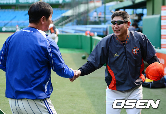 29일 오후 대전 한밭구장에서 열리는 '2012 팔도 프로야구' 한화 이글스와 삼성 라이온즈의 경기 시작전 류중일 감독과 한대화 감독이 악수를 나누고 있다.