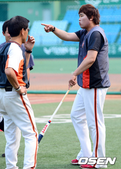 29일 오후 대전 한밭구장에서 열리는 '2012 팔도 프로야구' 한화 이글스와 삼성 라이온즈의 경기 시작전 류현진이 훈련을 하고 있는 동료들에게 이야기를 건내고 있다.