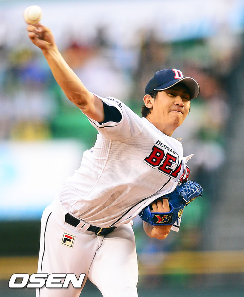 29일 오후 서울 잠실구장에서 열린 두산 베어스와 KIA 타이거즈의 경기에서 두산 선발 이용찬이 힘차게 공을 뿌리고 있다.