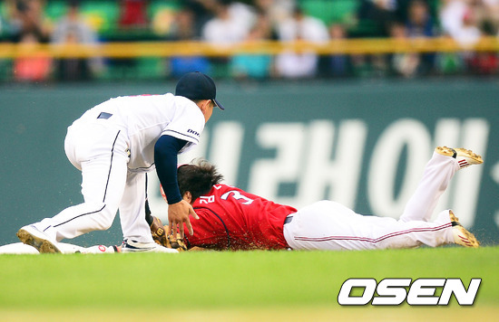 29일 오후 서울 잠실구장에서 열린 두산 베어스와 KIA 타이거즈의 경기에서 1회초 1사 주자 1루 KIA 김원섭 타석에서 1루 주자 김선빈이 2루 도루에 실패하고 있다.