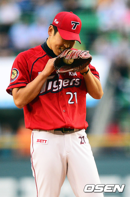 29일 오후 서울 잠실구장에서 열린 두산 베어스와 KIA 타이거즈의 경기에서 1회말 KIA 선발 윤석민이 마운드 위에서 글러브 끈을 이빨로 잡아당기고 있다.