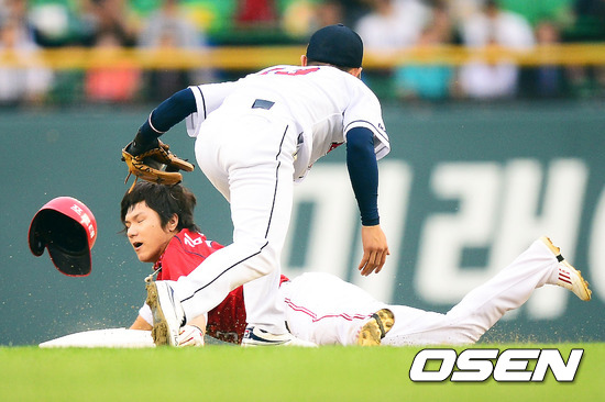 29일 오후 서울 잠실구장에서 열린 두산 베어스와 KIA 타이거즈의 경기에서 1회초 1사 주자 1루 KIA 김원섭 타석에서 1루 주자 김선빈이 2루 도루에 실패하고 있다.