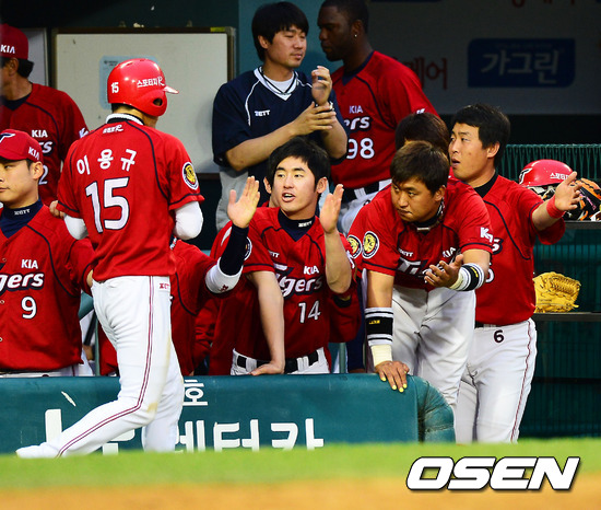 29일 오후 서울 잠실구장에서 열린 두산 베어스와 KIA 타이거즈의 경기에서 3회초 2사 주자 3루 KIA 최희섭 타석에서 두산 선발 이용찬의 와일드 피칭으로 3루 주자 이용규가 홈을 밟은 후 덕아웃에서 동료들과 기쁨을 나누고 있다.