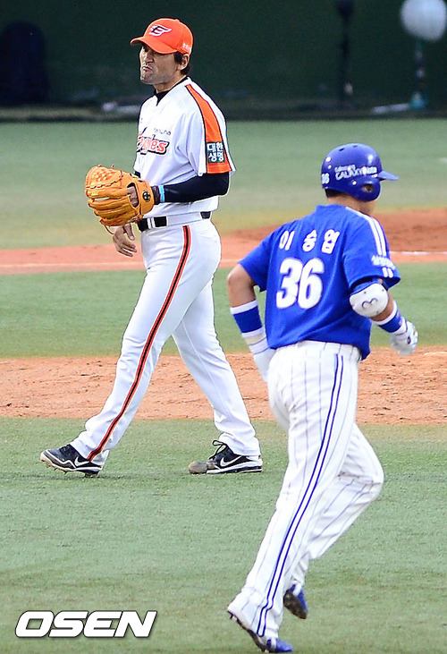 29일 오후 대전 한밭구장에서 열린 '2012 팔도 프로야구' 한화 이글스와 삼성 라이온즈의 경기 2회초 선두타자 이승엽이 외야 뜬공으로 아웃을 당하고 덕아웃으로 향하고 있다.