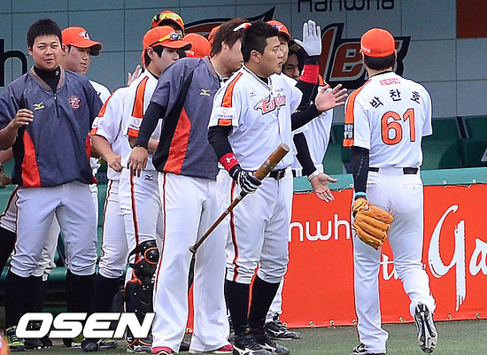 29일 오후 대전 한밭구장에서 열린 '2012 팔도 프로야구' 한화 이글스와 삼성 라이온즈의 경기 2회초를 마친 박찬호가 덕아웃으로 향하며 동료들과 하이파이브를 하고 있다.