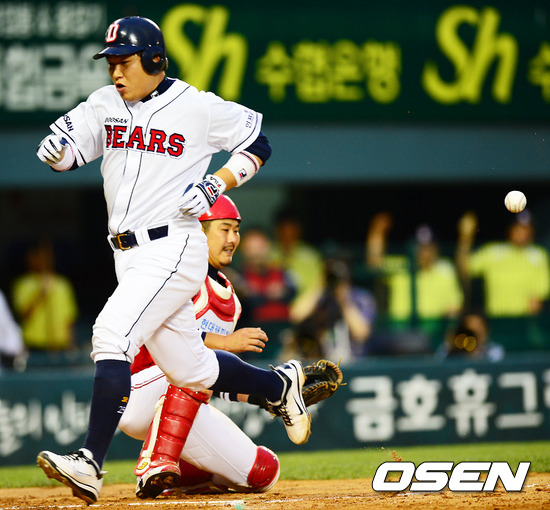 29일 오후 서울 잠실구장에서 열린 두산 베어스와 KIA 타이거즈의 경기에서 3회말 1사 주자 3루 두산 손시헌의 우익수 희생 플라이 아웃때 3루 주자 양의지가 홈을 밟고 있다.