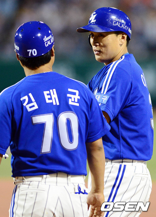 29일 오후 대전 한밭구장에서 열린 '2012 팔도 프로야구' 한화 이글스와 삼성 라이온즈의 경기 4회초 2사 만루 이승엽이 2타점 적시타를 치고 1루에서 김태균 코치와 이야기를 하며 미소를 짓고 있다.