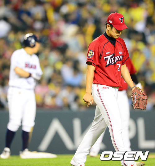 29일 오후 서울 잠실구장에서 열린 두산 베어스와 KIA 타이거즈의 경기에서 4회말 첫타석에서 두산 김현수가 좌중간 3루타를 날리자 KIA 선발 윤석민이 고개를 숙이고 있다.