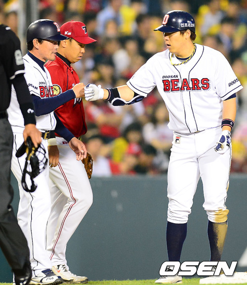 29일 오후 서울 잠실구장에서 열린 두산 베어스와 KIA 타이거즈의 경기에서 4회말 첫타석에서 두산 김현수가 좌중간 3루타를 날린 후 3루에서 김민호 코치와 하이파이브를 하고 있다.