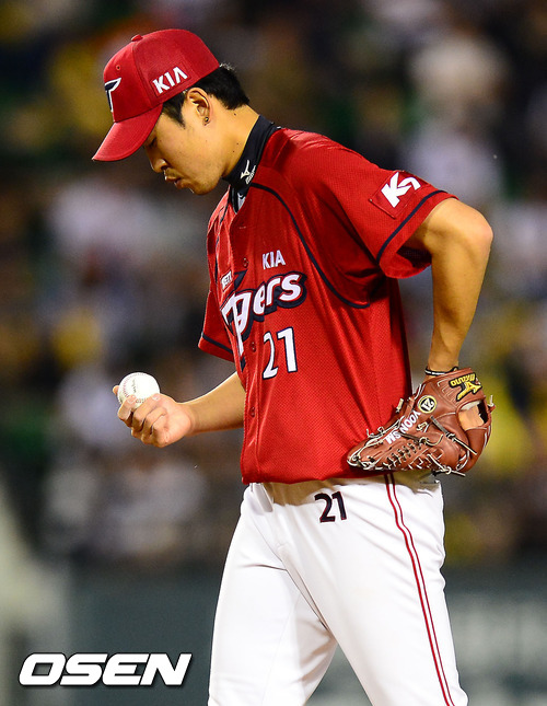 29일 오후 서울 잠실구장에서 열린 두산 베어스와 KIA 타이거즈의 경기에서 4회말 1사 주자 1,2루 두산 양의지가 좌익수 왼쪽 1타점 적시타를 날리자 KIA 선발 윤석민이 공을 바라보며 아쉬워하고 있다.