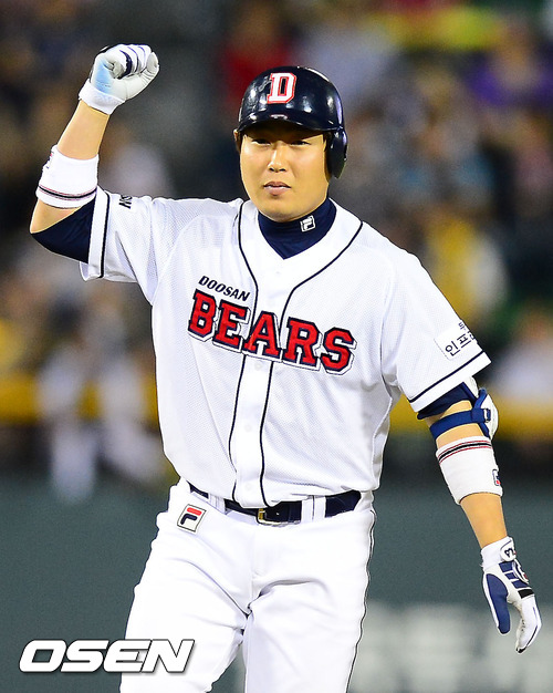 29일 오후 서울 잠실구장에서 열린 두산 베어스와 KIA 타이거즈의 경기에서 4회말 1사 주자 1,2루 두산 양의지가 좌익수 왼쪽 1타점 적시타를 날린 후 2루에서 기뻐하고 있다.