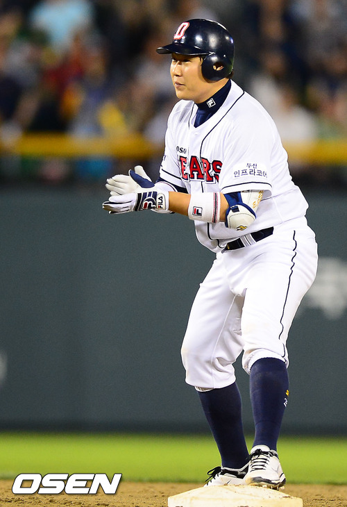 29일 오후 서울 잠실구장에서 열린 두산 베어스와 KIA 타이거즈의 경기에서 4회말 1사 주자 1,2루 두산 양의지가 좌익수 왼쪽 1타점 적시타를 날린 후 2루에서 박수를 치고 있다.