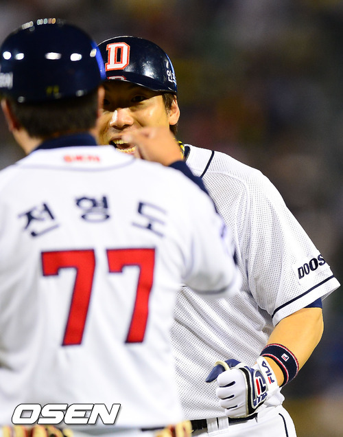 29일 오후 서울 잠실구장에서 열린 두산 베어스와 KIA 타이거즈의 경기에서 5회말 1사 주자 3루 두산 김현수가 중전 1타점 적시타를 날린 후 1루에서 환호하고 있다.