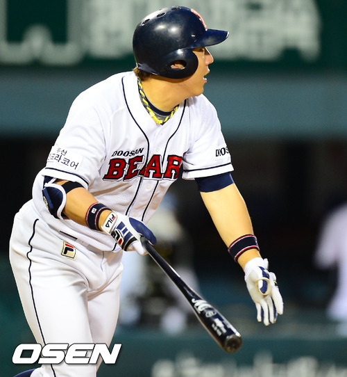 29일 오후 서울 잠실구장에서 열린 두산 베어스와 KIA 타이거즈의 경기에서 4회말 첫타석에서 두산 김현수가 좌중간 3루타를 날리고 있다.