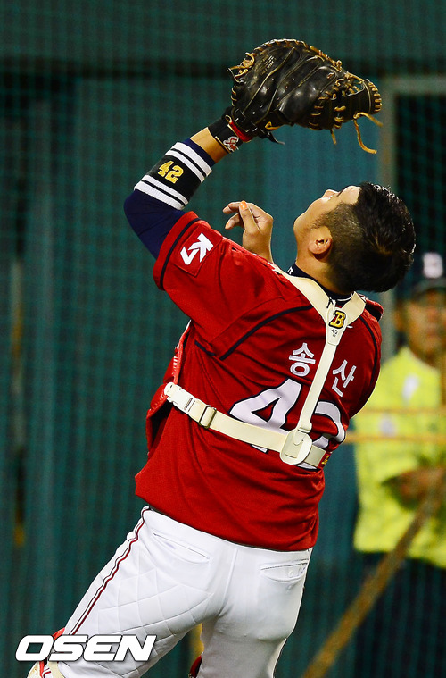 29일 오후 서울 잠실구장에서 열린 두산 베어스와 KIA 타이거즈의 경기에서 5회말 2사 주자 1루 두산 최준석의 타구를 KIA 송산이 볼을 받아내고 있다.