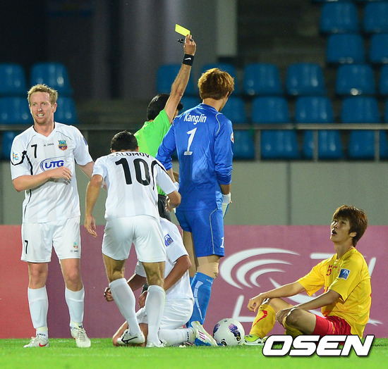 29일 오후 성남 탄천종합운동장에서 2012 아시아챔피언스리그(ACL) 16강전 성남일화와 우즈베키스탄 부뇨드코르 무르조예프에게 반칙을 범해 페널티킥을 허용한 뒤 옐로카드를 받고 있다.