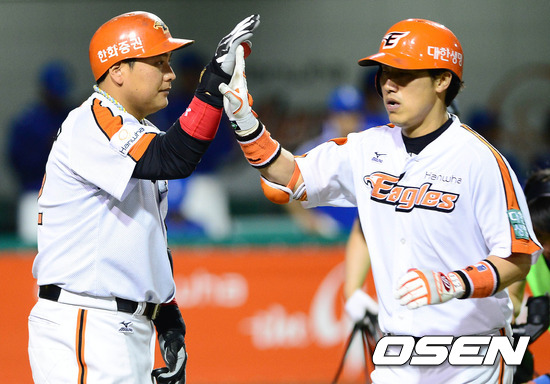 29일 오후 대전 한밭구장에서 열린 '2012 팔도 프로야구' 한화 이글스와 삼성 라이온즈의 경기 6회말 2사 3루 장성호가 투런포 친 후 홈에서 김태균과 하이파이브를 하고 있다.