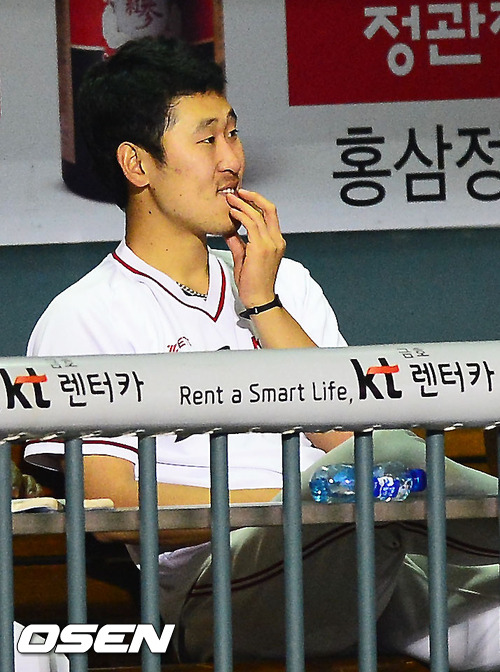 29일 오후 서울 잠실구장에서 열린 두산 베어스와 KIA 타이거즈의 경기에서 KIA 선발 윤석민이 6회말 덕아웃에서 불안한 표정으로 경기를 지켜보고 있다.