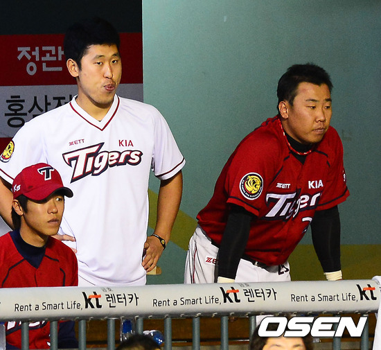 29일 오후 서울 잠실구장에서 열린 두산 베어스와 KIA 타이거즈의 경기에서 9회초 KIA 선발 윤석민과 이범호가 덕아웃에서 아쉬운 표정으로 경기를 주시하고 있다.