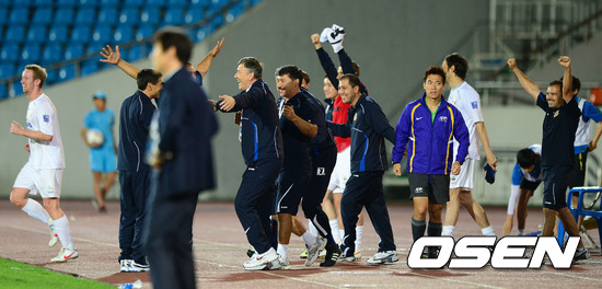 경기후 성남 신태용 감독이 아쉬워하는 반면 부뇨드코르 선수단이 기뻐하고 있다./jpnews@osen.co.kr