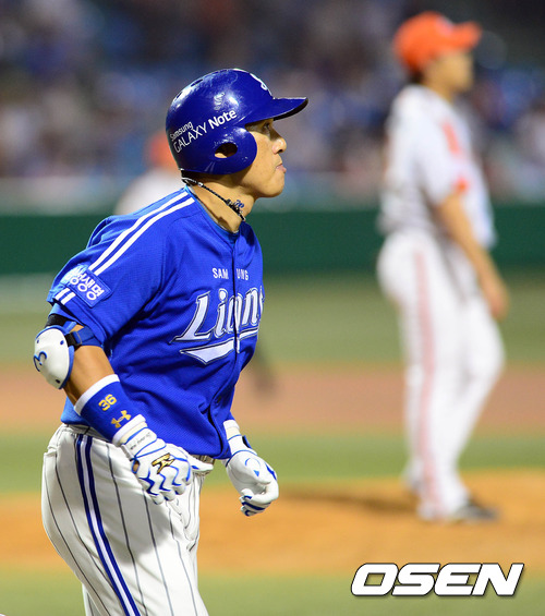 29일 오후 대전 한밭구장에서 열린 '2012 팔도 프로야구' 한화 이글스와 삼성 라이온즈의 경기 9회초 선두타자 이승엽이 솔로포를 친 후 베이스를 돌고 있다.