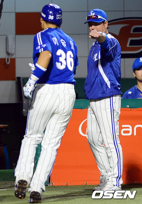 29일 오후 대전 한밭구장에서 열린 '2012 팔도 프로야구' 한화 이글스와 삼성 라이온즈의 경기 9회초 선두타자 이승엽이 솔로포를 친 후 덕아웃에서 류중일 감독과 하이파이브를 하고 있다.