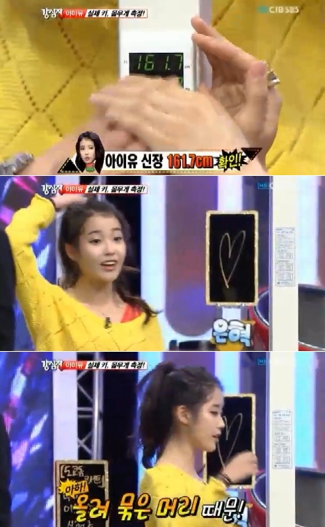 이날 측정한 아이유의 키는 161.7cm 44.9kg. "방송을 시작하기 직전 밥을 먹고 왔다"는 한 출연자의 증언을 감안해 아이유가 주장하는 몸무게 44kg임이 인증된 셈이다.
