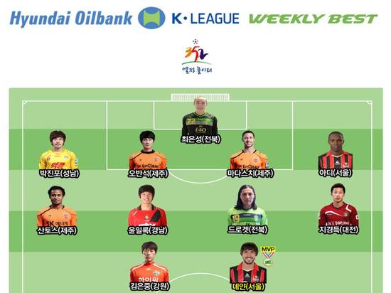 미드필더에는 이른 시간 선제골을 터뜨렸으며 이후에도 케빈, 김형범과 효과적인 공격을 이끈 지경득(대전) 에닝요의 공백을 메웠을 뿐 아니라 이동국과의 호흡으로 상생 효과를 창출한 드로겟(전북) 돋보이는 축구센스와 일대일 능력은 물론 포항전에 마무리 능력까지 장착한 윤일록(경남) 제주의 화려한 패스 플레이의 정점에 있는 선수로 해결사 능력까지 과시한 산토스(제주)를 선정했다.