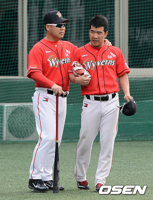 30일 오후 서울 목동야구장에서 열린 '2012 팔도 프로야구' 넥센 히어로즈와 SK 와이번스의 경기에 앞서 SK 이만수 감독이 그라운드에 나온 정근우를 격려하고 있다. 정근우는 29일 경기서 넥센 투수 나이트가 던진 공에 헬멧을 강타 당했지만 정밀 검사 결과 특별한 부상이 없는 것으로 알려졌다.