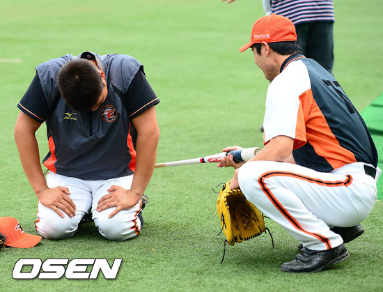 30일 오후 대전 한밭야구장에서 한화 이글스와 삼성 라이온즈의 경기가 열릴 예정인 가운데 양 팀 훈련시간에 한화 한용덕 코치가 무릎을 꿇은 최진행에게 배트로 장난을 치고 있다.
