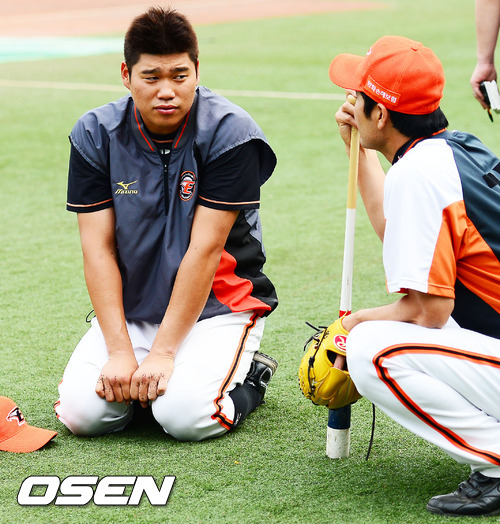 30일 오후 대전 한밭야구장에서 한화 이글스와 삼성 라이온즈의 경기가 열릴 예정인 가운데 양 팀 훈련시간에 한화 한용덕 코치가 무릎을 꿇은 최진행에게 장난을 치고 있다.