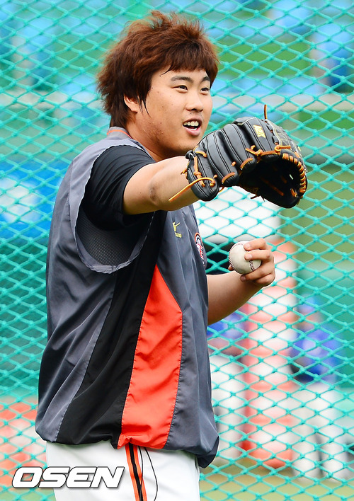 30일 오후 대전 한밭야구장에서 한화 이글스와 삼성 라이온즈의 경기가 열릴 예정인 가운데 양 팀 훈련시간에 한화 류현진이 불펜에서 피칭연습을 하며 장난을 치고 있다.