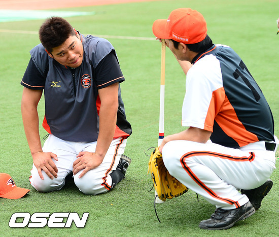 30일 오후 대전 한밭야구장에서 한화 이글스와 삼성 라이온즈의 경기가 열릴 예정인 가운데 양 팀 훈련시간에 한화 한용덕 코치가 무릎을 꿇은 최진행에게 장난을 치고 있다.