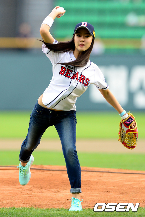 30일 오후 서울 잠실구장에서 열린 '2012 팔도 프로야구' 두산 베어스와 KIA 타이거즈의 경기, 경기전 레인보우 고우리가 시구를 하고 있다.