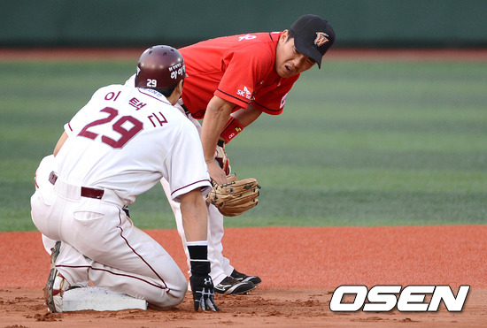 30일 오후 서울 목동야구장에서 열린 '2012 팔도 프로야구' 넥센 히어로즈와 SK 와이번스의 경기, 1회말 2사 1루 넥센 박병호 타석때 도루에 성공한 1루주자 이택근이 SK 정근우와 이야기를 하고 있다.