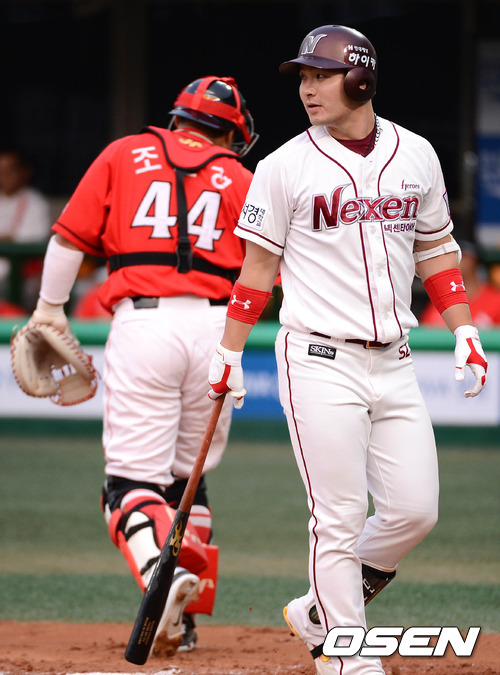 30일 오후 서울 목동야구장에서 열린 '2012 팔도 프로야구' 넥센 히어로즈와 SK 와이번스의 경기, 1회말 2사 2루 넥센 박병호가 삼진으로 물러나고 있다.