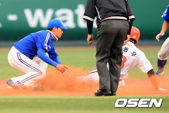 30일 오후 대전 한밭야구장에서 열린 한화 이글스와 삼성 라이온즈의 경기에서 1회말 무사 주자 1루 한화 오재필이 삼진아웃을 당할때 1루 주자 강동우가 2루로 도루를 시도, 삼성 유격수 김상수에게 2루에서 태그아웃당하고 있다.