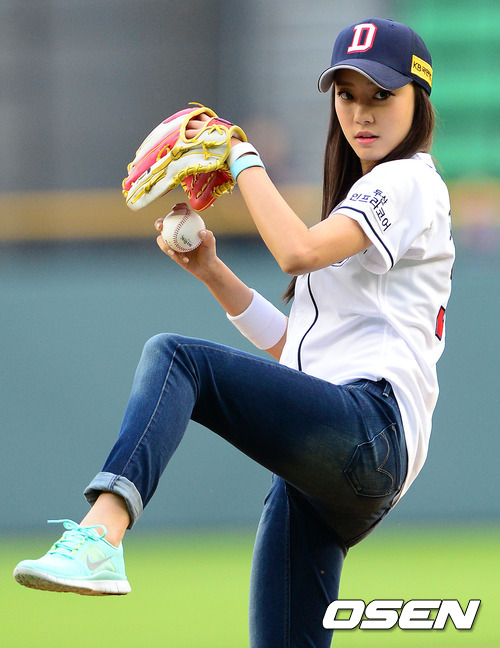 30일 오후 서울 잠실구장에서 열린 '2012 팔도 프로야구' 두산 베어스와 KIA 타이거즈의 경기, 경기전 레인보우 고우리가 시구를 하고 있다.