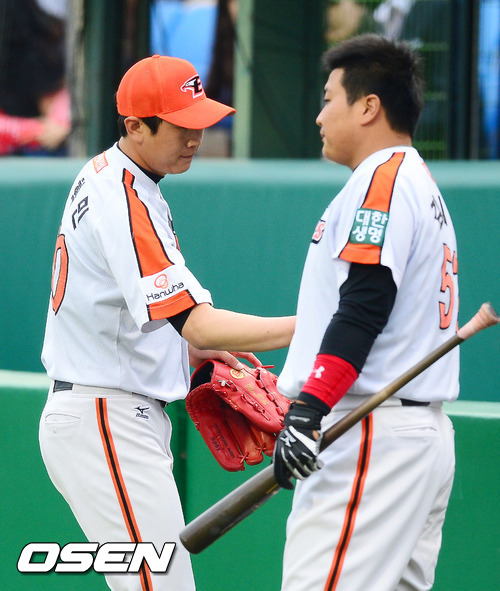 30일 오후 대전 한밭야구장에서 열린 한화 이글스와 삼성 라이온즈의 경기에서 1회를 마치고 한화 선발 김혁민이 덕아웃에서 김태균과 하이파이브를 하고 있다.