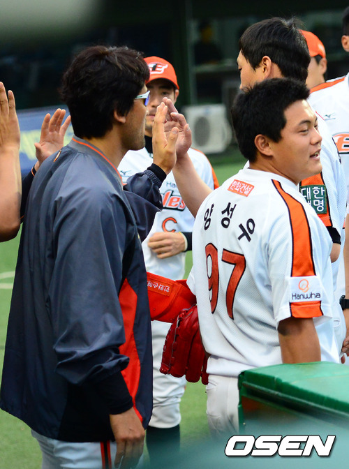30일 오후 대전 한밭야구장에서 열린 한화 이글스와 삼성 라이온즈의 경기에서 3회를 마치고 한화 선발 김혁민이 박찬호와 하이파이브를 하고 있다.