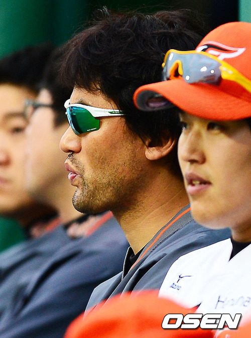 30일 오후 대전 한밭야구장에서 열린 한화 이글스와 삼성 라이온즈의 경기에서 한화 박찬호가 덕아웃에서 한화 선발 김혁민의 호투를 바라보며 놀란 표정을 짓고 있다.