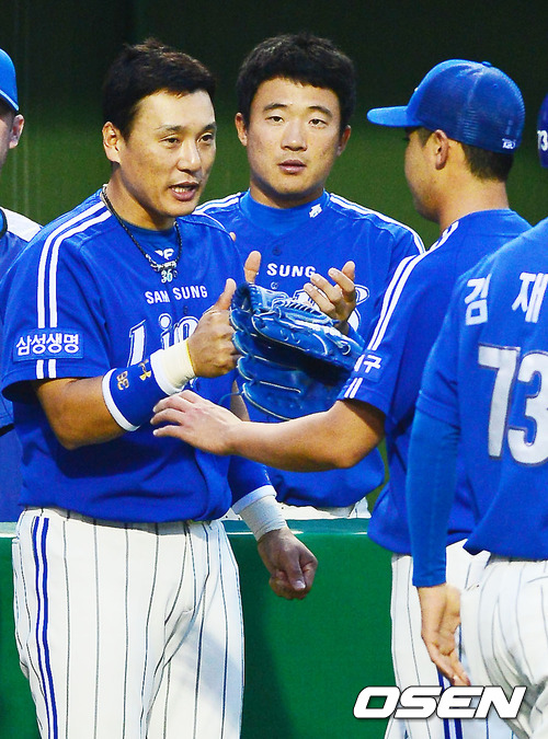 30일 오후 대전 한밭야구장에서 열린 한화 이글스와 삼성 라이온즈의 경기에서 4회말을 마치고 덕아웃으로 들어오는 삼성 선발 장원삼에게 이승엽이 최고라는 사인을 보내며 하이파이브를 하고 있다.