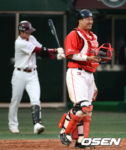 30일 오후 서울 목동야구장에서 열린 '2012 팔도 프로야구' 넥센 히어로즈와 SK 와이번스의 경기, 3회말 1사 넥센 김민우 타석때 SK 포수 조인성이 투수 박종훈을 바라보며 미소를 짓고 있다.