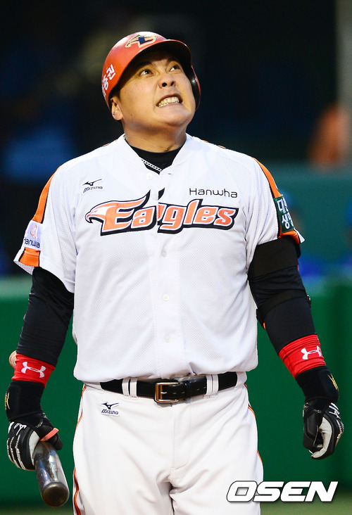 30일 오후 대전 한밭야구장에서 열린 한화 이글스와 삼성 라이온즈의 경기에서 4회말 2사 주자 없는 상황에서 한화 김태균이 파울 타구를 날린 후 아쉬운 표정으로 타구를 바라보고 있다.