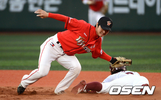 30일 오후 서울 목동야구장에서 열린 '2012 팔도 프로야구' 넥센 히어로즈와 SK 와이번스의 경기, 3회말 2사 1루 넥센 서건창 타석때 1루주자 정수성이 도루에 성공하고 있다.