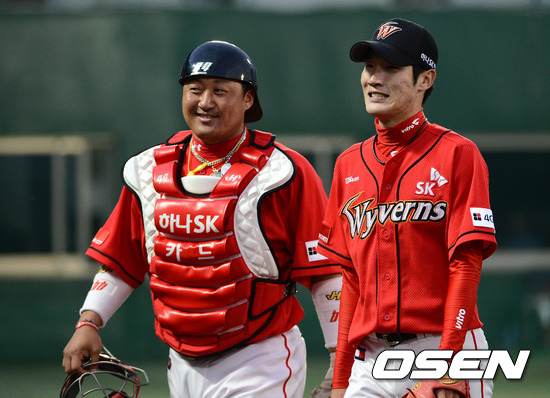 30일 오후 서울 목동야구장에서 열린 '2012 팔도 프로야구' 넥센 히어로즈와 SK 와이번스의 경기, 3회말 2사 1,2루 넥센 이택근을 내야땅볼로 처리한 SK 박종훈이 포수 조인성과 이야기를 나누며 더그아웃으로 가고 있다.