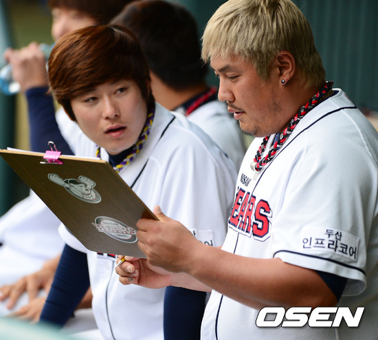 30일 오후 서울 잠실구장에서 열린 '2012 팔도 프로야구' 두산 베어스와 KIA 타이거즈의 경기, 경기전 주전에서 제외된 두산 최준석이 경기 기록을 준비하며 이원석과 이야기를 나누고 있다.
