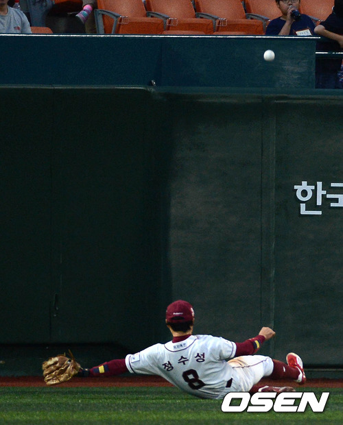 30일 오후 서울 목동야구장에서 열린 '2012 팔도 프로야구' 넥센 히어로즈와 SK 와이번스의 경기, 4회말 2사 넥센 정수성이 SK 조인성의 타구를 놓치고 있다.