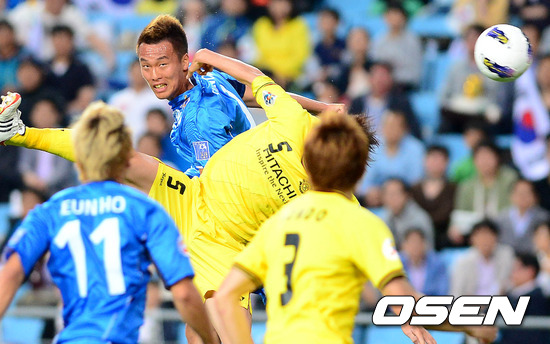 30일 오후 울산 문수축구경기장에서 열린 '2012 아시아축구연맹 챔피언스리그(ACL)' 16강전 울산 현대와 가시와 레이솔의 경기 전반 김신욱이 문전에서 이근호에게 볼을 연결시키고 있다.